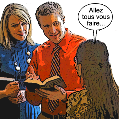 Sauf exception ou par étourderie, je ne réponds pas aux questions des démarcheurs, d'une part, rien ne m'y oblige, d'autre part, ils n'ont pas à savoir ce que je fais, où je vais, ni ce que je pense. Je pourrais être désagréable mais je reste courtois car la plupart du temps, ce sont des personnes sympathiques et souriantes. Ce n’est pourtant pas l’envie qui me manque de les envoyer balader. En revanche, quand ils insistent, je leur ferme la porte au nez, ça les calme. Anecdote : à l’époque où je décrochais mon téléphone, une démarcheuse me propose je ne sais plus quel service inutile. Très poliment je lui réponds : « non, merci ». Derechef, elle monte sur ses grands chevaux et hausse le ton : « Pourquoi vous me dites merci ? Merci de quoi ? Je ne vous ai rien vendu ! » Ce à quoi je réplique : « je vous ai dit merci parce que je suis poli, je pourrais vous dire un autre mot de cinq lettres qui commence de la même façon. Au revoir ! » et je lui raccroche au nez. Non mais !