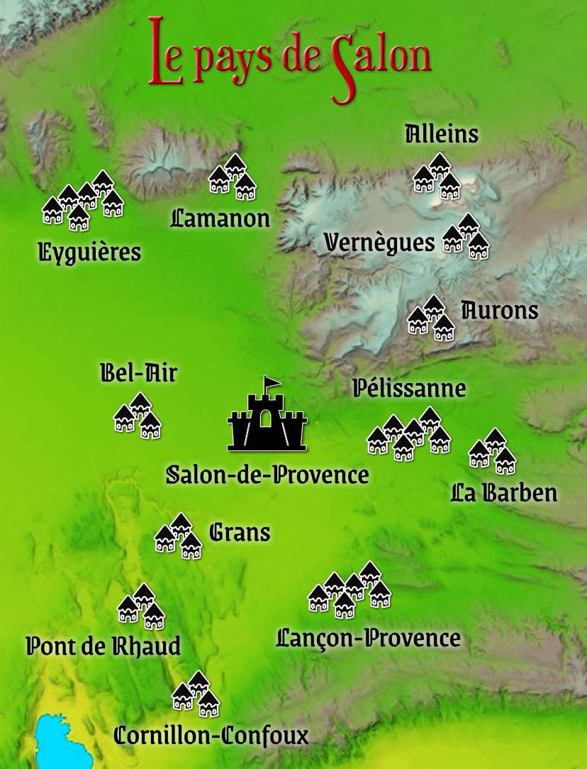 Le pays de Salon, cadre de ces contes, étend son territoire entre les Alpilles au nord, le pays d’Aix à l’est, les plaines de la Crau à l’ouest et l’étang de Berre au sud. Au centre de ce petit pays, une ville s’est bâtie autour de son château médiéval, Salon-de-Provence, la magistrale, brillante d’un passé qui a marqué l’Histoire. Ici, vécurent et séjournèrent des personnages illustres, Adam de Craponne, Nostradamus, la reine Catherine de Médicis, le roi Charles IX ou encore les archevêques d’Arles.